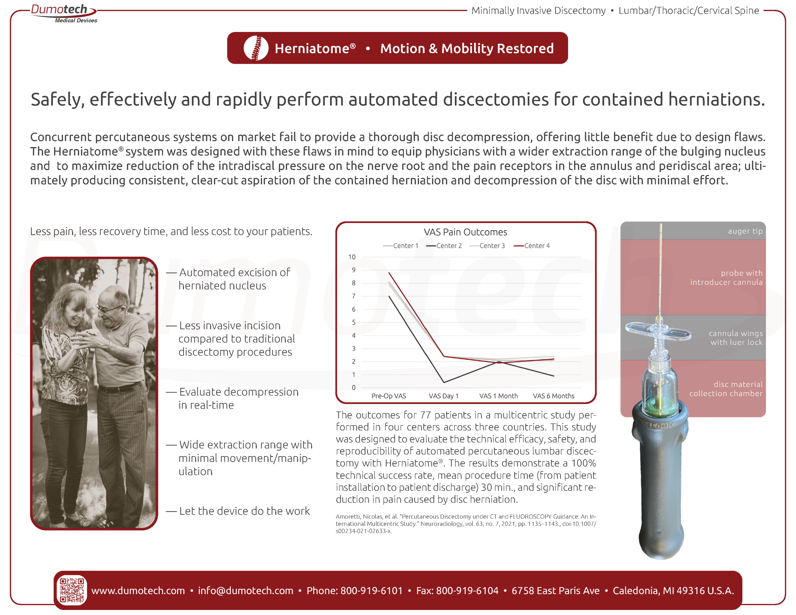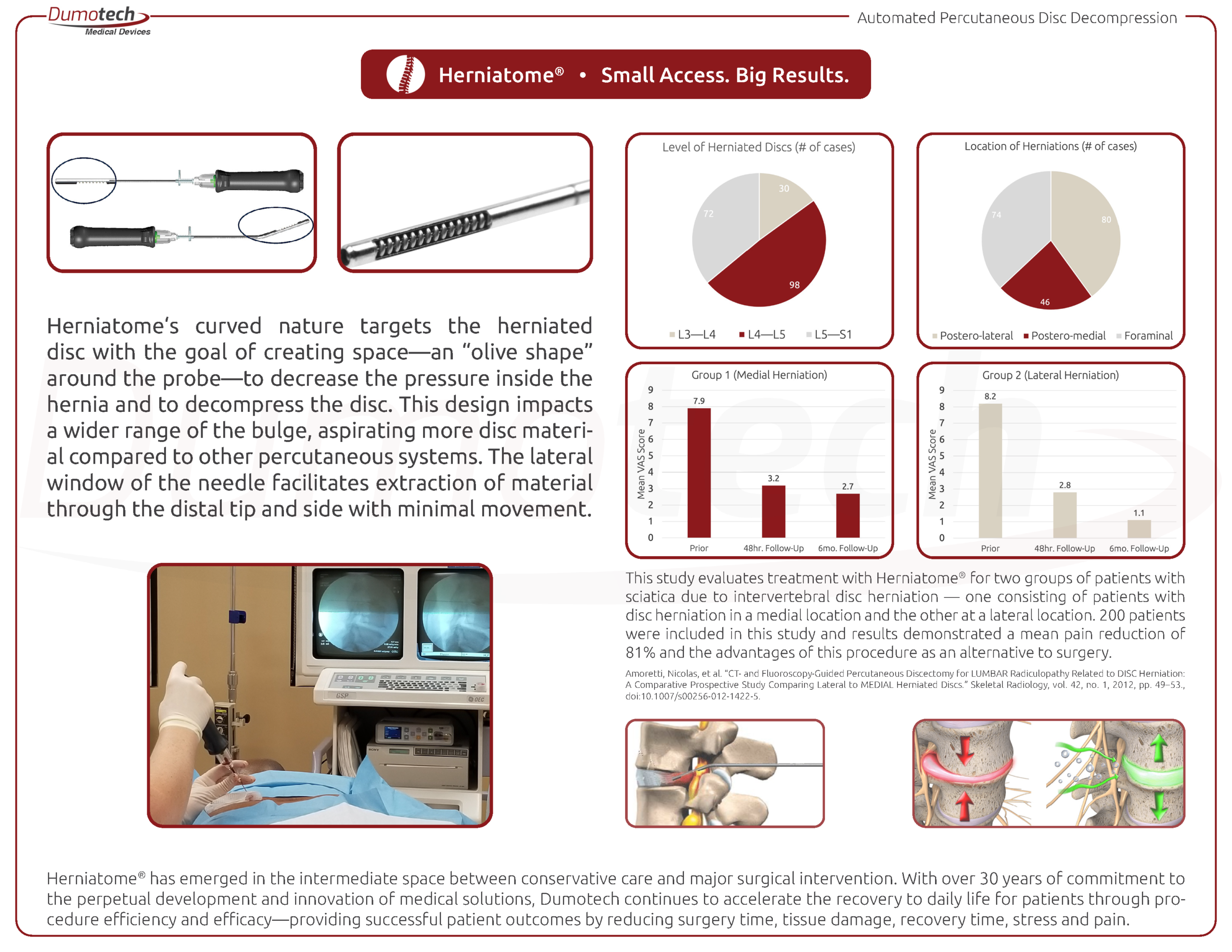 Herniatome is a novel, needle-based tool designed to cut, grind and aspirate disc tissue for percutaneous discectomy procedures. This innovative system offers a minimal-access approach to efficiently treat the damaged disc without injuring the surrounding disc anatomy. The Heriatome System has evolved from the combination of surgical decompression and intradiscal guided imaging. This is a safe, effective and minimally invasive procedure, the aim of which is identical to that of surgery to extract the herniation and reduce pressure on the nerve root. This procedure is a clinically proven alternative to surgical intervention and does not require an extended hospital stay.