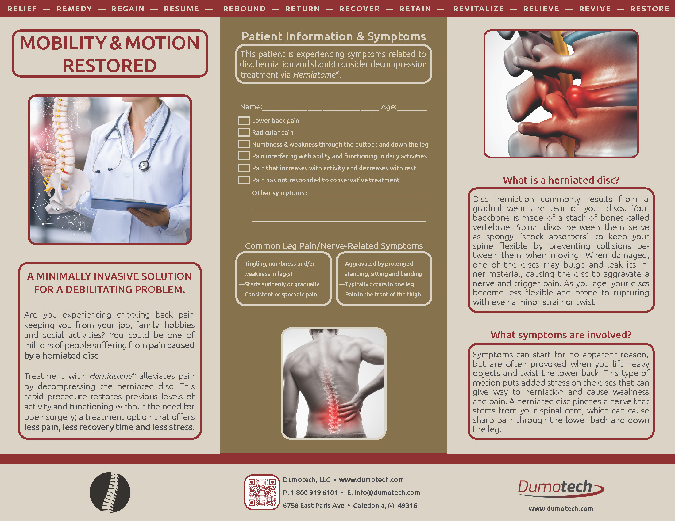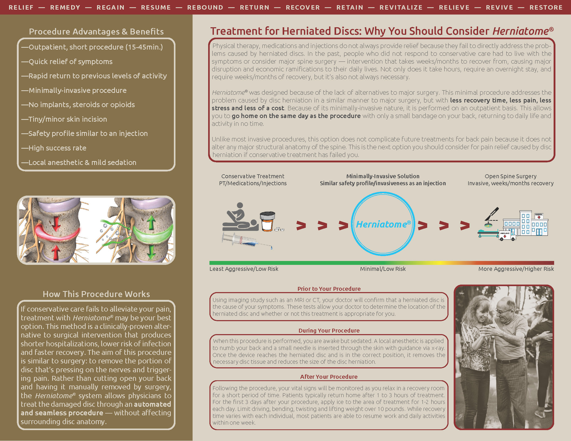 Typically, those suffering from contained disc herniations are offered conservative care such as medication, injections and/or physical therapy. When conservative treatments fail to relieve this pain, only 2 options remain on the table for the patient: perpetual opioids or major spine surgery—neither of which is desirable. Not only that, but with surgery comes weeks to months of recovery time and a significant disruption of one's daily life. Herniatome has emerged to provide an alternative for patients who have failed conservative care and who are not yet ready or do not need major surgery. This minimally invasive procedure is handled on an outpatient setting, allowing patients to return home that day and back to their daily lives in no time.